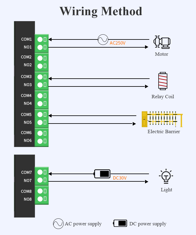 The digital input terminal is connected with a manual switch, such as: a 86-type switch to control the relay output of the corresponding channel to realize manual control and host computer control, that is, dual control, without wiring.