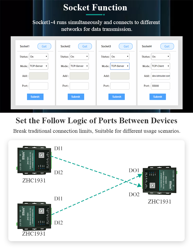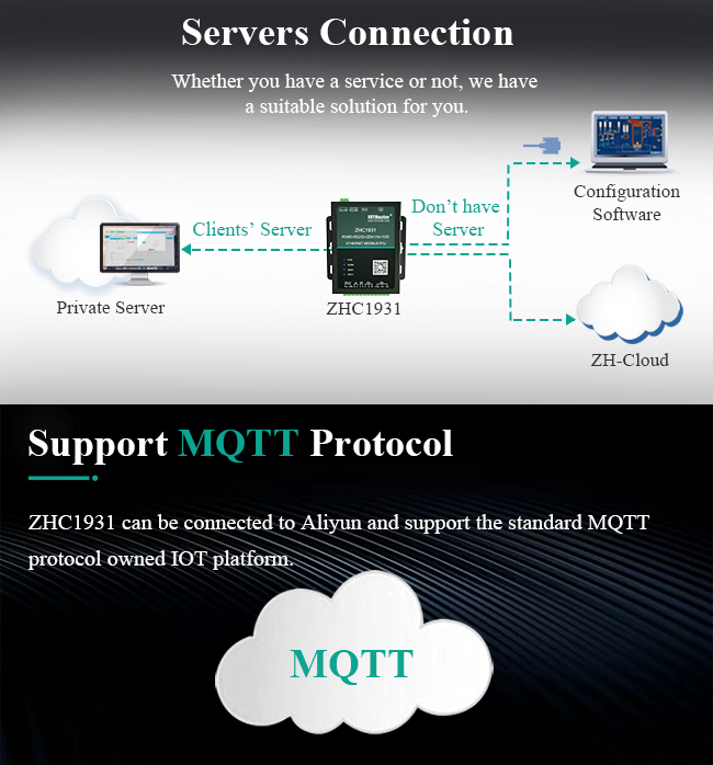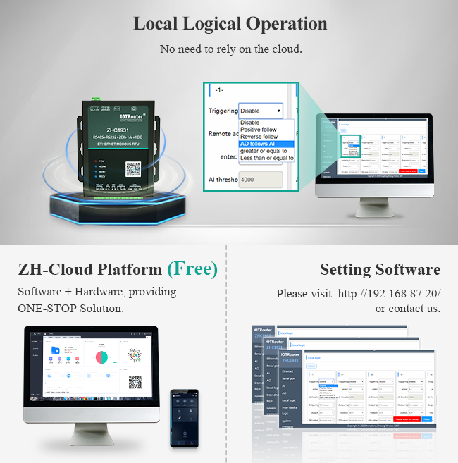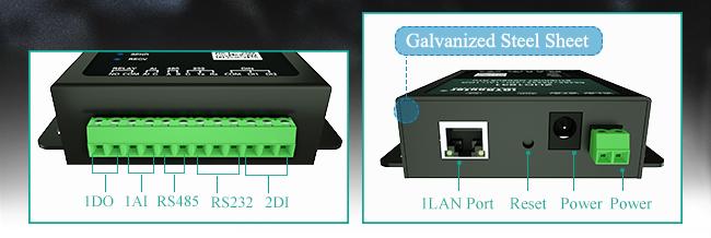 ZHC1931 is a network IO product that supports 2 dry (wet) node detection, 1 relay (COM, NO) output, 1 analog (current 4-20mA) detection, and 2 serial port transparent transmission. It is compatible with Modbus RTU/ TCP protocol.
