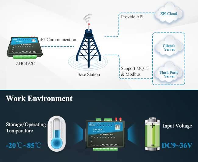 ZHC492C support 4-channel dry (wet) node detection, 4-channel relay (COM, NO, NC) Output, 4 channel analog quantity (current 4~20mA) detection, 1 channel RS485 transparent network IO products, compatible with Modbus RTU/TCP protocol. With remote control as the core function, it is highly easy to use, users can easily and quickly integrate into their own systems to realize remote and local control based on LTE, RS485.